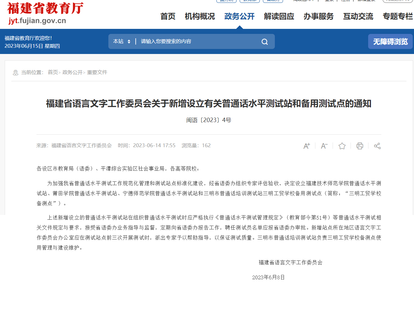 6月8日,福建省教育厅官网公布,我校正式获批设立“普通话水平测试站”。自此,我校可自主组织开展面向校内师生的普通话水平测试工作,标志着我校语言文字工作进入了一个崭新的阶段。