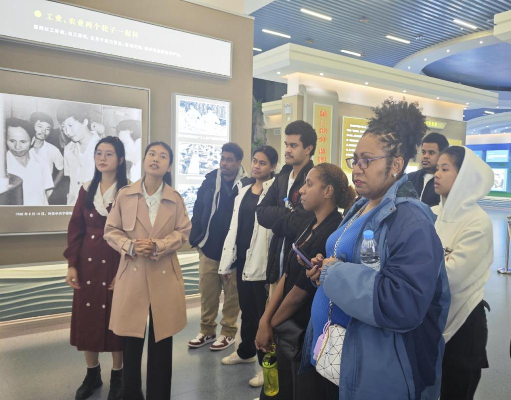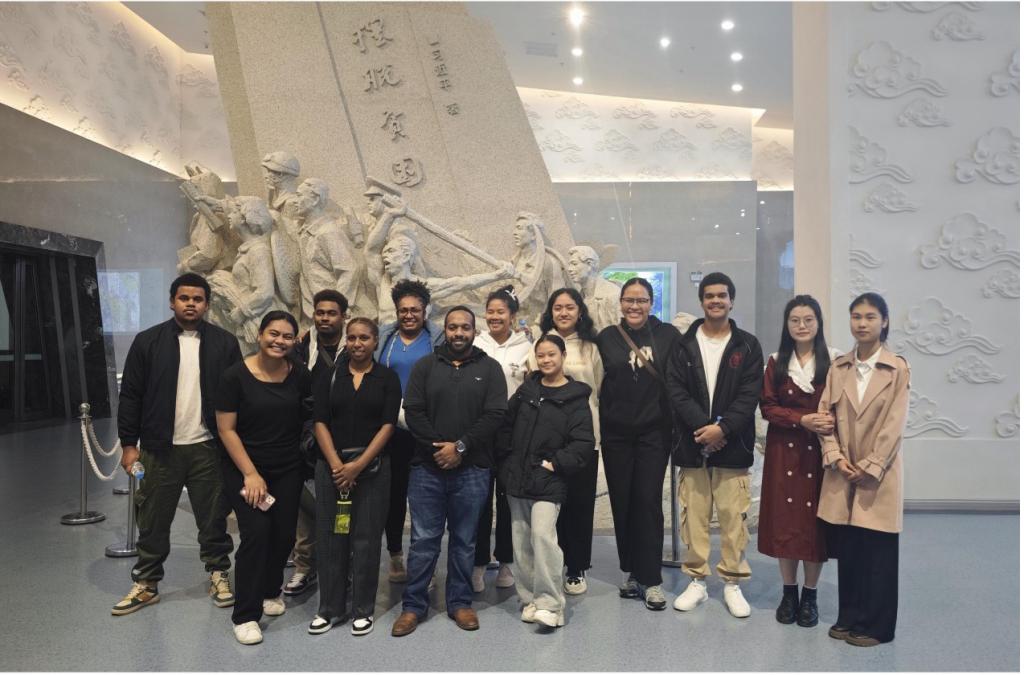 2024年11月25日,我院英语专业郜涵琪同学和潘婉容同学作为陪同翻译助手,在宁德市对外交流服务中心郑延就主任带领下,一同前往摆脱贫困主题展馆,为来访宁德的太平洋岛国留学生代表团翻译并讲解宁德脱贫之路的故事。