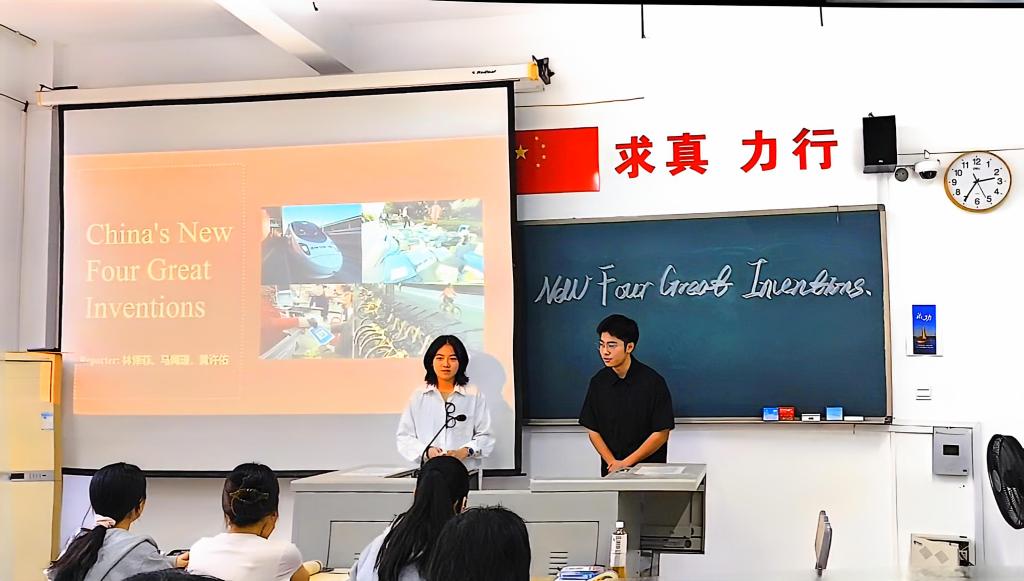 本堂课的教学内容为Unit 5 Science and Technology,。首先,游灼梅老师以让学生通过小组合作的方式介绍“中国新四大发明”导入课堂主题,学生小组合作全英文融合了脱口秀、采访和情景剧的形式,将现在与过去的科技高度串联,形式创新有趣,突出了以学生为中心的教学理念。接着,让同学们在预习的时候,完成学习通布置的讨论问题,课上针对性讲解,做到了线上与线下混合式教学的应用。此外,在解析文本的过程中,通过深入探讨我国古代科学与技术之所以繁荣发展的缘由,采用了以问题为引领的导入方法,激励学生带着探求之心进行思考。这一方式不仅促进了学生的主动思考,还有效地引导他们增强了对于发展道路的坚定信念、对于科学理论的自信心、对于制度优势的认同感,以及对于深厚文化底蕴的自豪感,即道路自信、理论自信、制度自信和文化自信。