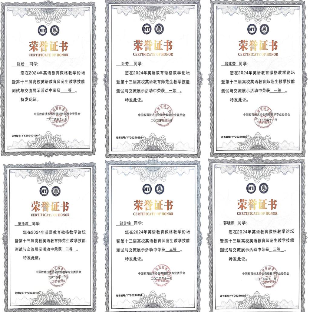 2024年11月15日至18日,由中国教育技术协会微格教学专业委员会主办、黄冈师范学院承办的2024年英语微格教学论坛暨第十三届高校英语教育师范生教学技能测试与交流展示活动在湖北省黄冈市顺利举行。来自华中师范大学、西南大学、四川师范大学、西北师范大学等全国90余所高校的327名选手报名参赛。参赛选手涵盖本科、研究生学段,授课内容包括小学、初中、高中全部学段,活动覆盖面广,选手综合素质高。我院英语专业六名同学在英语系相关老师的组织和悉心指导下,以精妙的教学设计、精美的课件、生动的语言、优秀的课堂呈现在比赛中脱颖而出,取得了优异成绩。其中,翁建莹、陈粉、叶芳三位同学获得一等奖、范徐源同学获得二等奖;郭晓彤、邹芳锦两位同学获得三等奖。