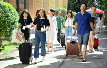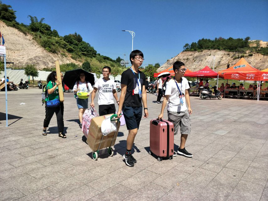 (工作人员帮助新生拿行李、带路)