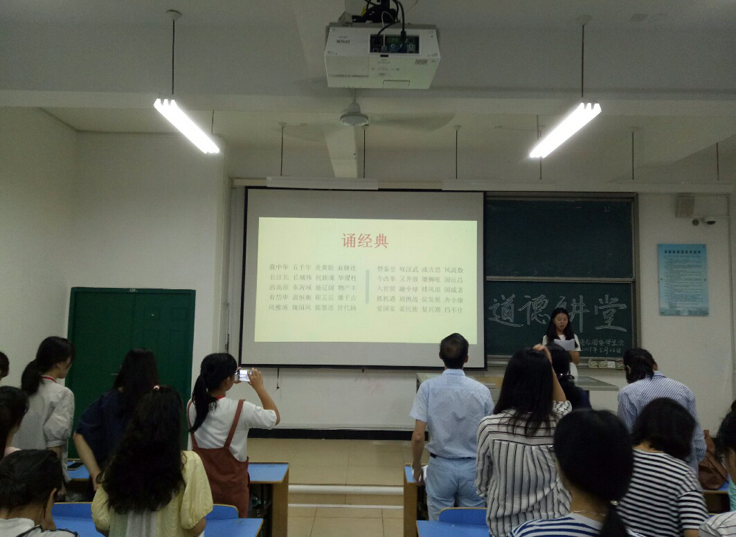 畅所欲言过后,开始了第五个环节:“诵一段经典”,在学生黄兰兰的领读下,全体师生一起诵读经典。