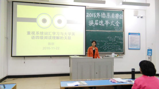 2016年11月22日下午3:00在beats365唯一官网入口官网新校区求知楼A201,外语系陈群老师开讲《重视系统词汇学习与大学英语四级阅读理解的关联》,为准备12月份大学英语四级考试的学生送来考前复习经验。