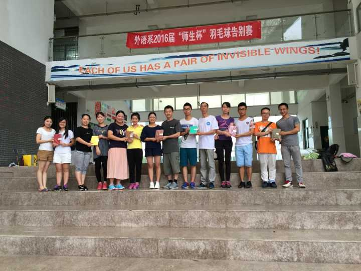 6月16日下午三点,外语系2016届“师生杯”毕业生羽毛球告别赛如期开赛。比赛分为男单、男双、女单、女双、混双五场。学生队的参赛选手均为2016届外语系毕业生:郭文昇、罗兴坚、练月玲、范佳丽、周珍珍、林朝雷、李丽丹等七人。外语系龚帆元、陈茂和、元佳珺、陈经纬、王锦炼、林艳、王晓莹等六名教师参赛。