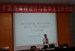 来自英国雷丁大学的John Slaght 与Sebastian Watkins 两位专家以讲座和示范课的形式以“学术英语教学:理念与原则”、“学术英语实践(一):学术英语阅读与写作”、“学术英语实践(二):学术英语听力与口语”为主题,对EAP,EGP, EGAP和ESAP的概念进行了梳理,对EAP课程的听、说、读、写的课堂教学提出了不同的教学方法,如对阅读的EAP课堂教学提出了3Q3R 的教学方法,此外,强调了EAP课程的课堂教学重在对学生思辨性思维的培养。河北经贸大学外语教学部主任高霄教授对河北经贸大学的EAP课程的设计与师资建设进行了详细的介绍,福建师范大学外国语学院院长林大津教授浅显又不乏幽默生动地讲解了跨文化能力的培养。