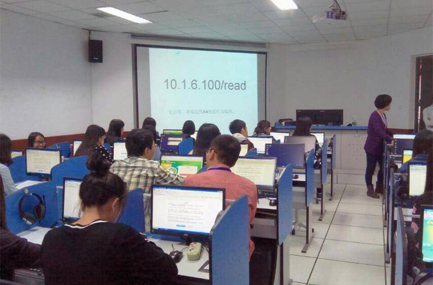 九点半,在求知楼Aa308举行校际交流研讨会,外研社的老师对与会老师们介绍此次比赛引进的Itest系统。