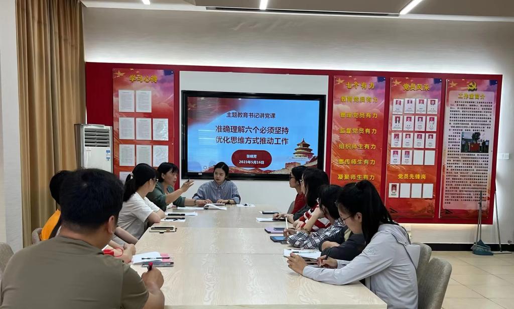 2023年5月16日下午,学院党委书记张晓芳以《准确理解六个必须坚持,优化思维方式推动工作》为题,在求知楼A408室给学生第二党支部全体党员讲授主题教育专题党课。