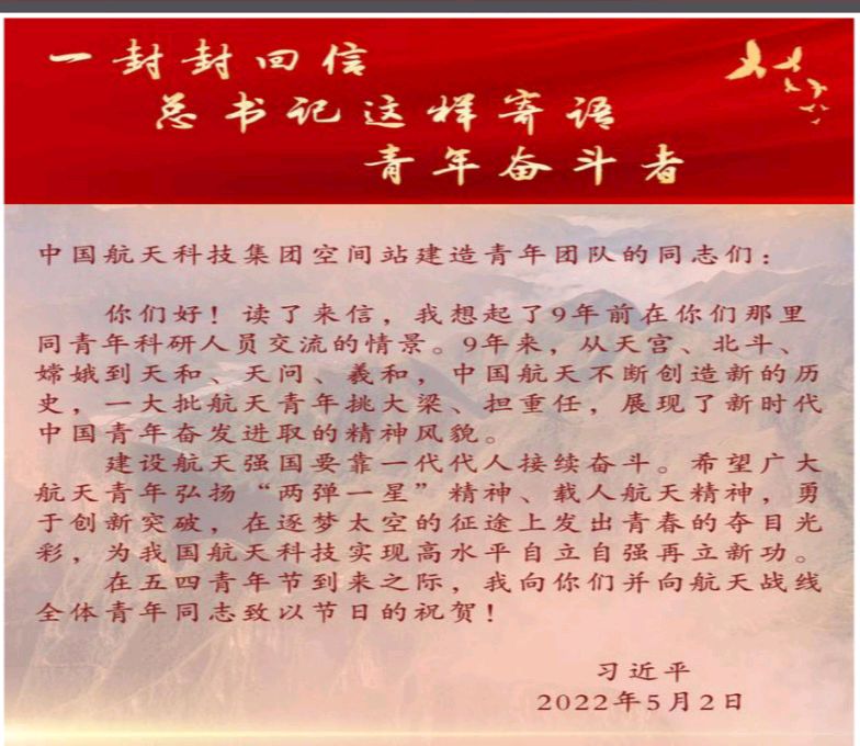 全体党员认真学习了习近平总书记在中国人民大学考察时重要讲话精神、庆祝中国共青团成立100周年大会上的重要讲话全文,和习近平总书记给中国航天科技集团空间站建造青年团队回信及新华社、人民日报的相关文章。
