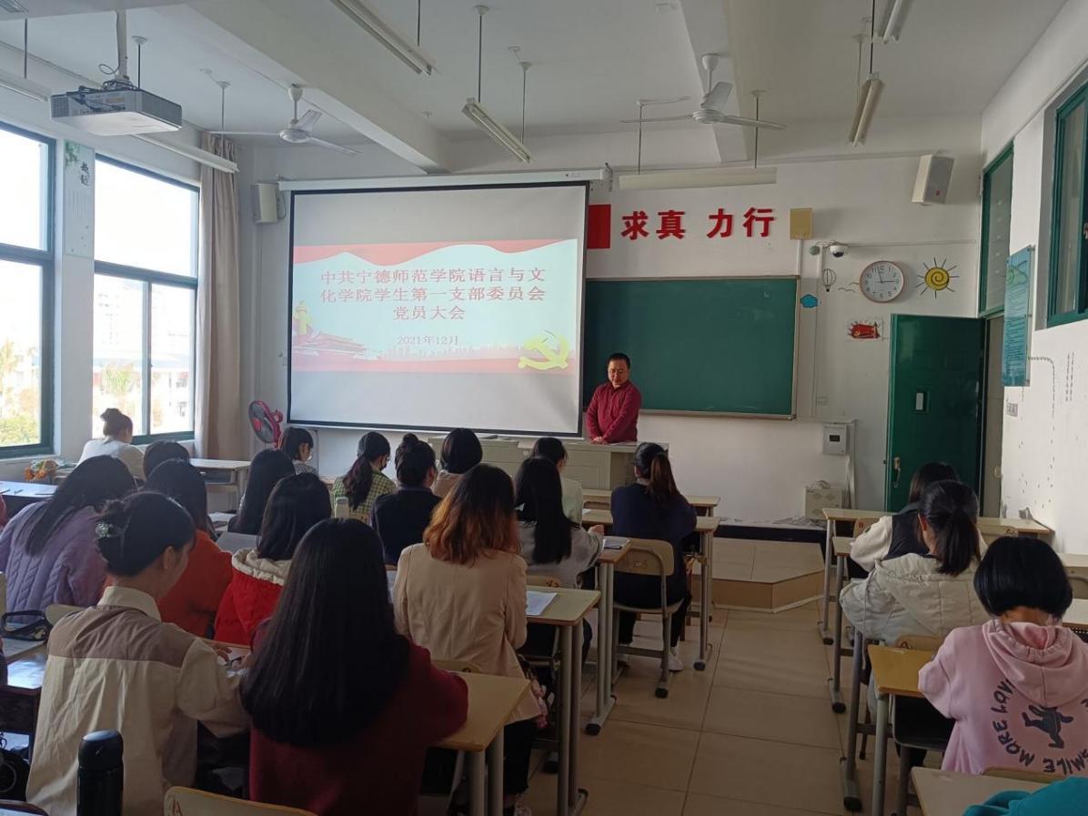 2021年12月10日下午,语言与文化学院学生第一党支部于AA302召开接收预备党员支部大会。本次会议由党支部书记林猤主持。支部全体党员出席。