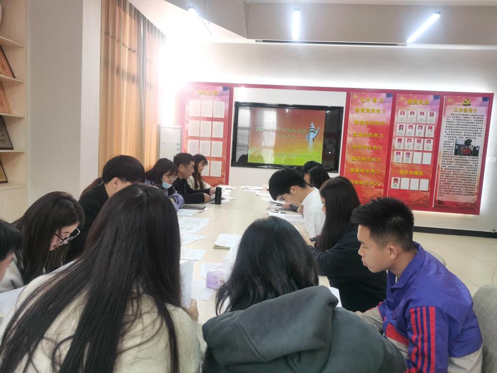 2021年12月9日,语言与文化学院学生第三支部于AA409召开接收预备党员大会,本次会议主要是讨论接收钟叶辉、陈雯轩、杨欢欢、杨程越、苏佳榕、李诗琪、刘雪莲、卢刚等8位发展对象为预备党员。会议由书记徐晓春主持。支部全体党员出席了会议。