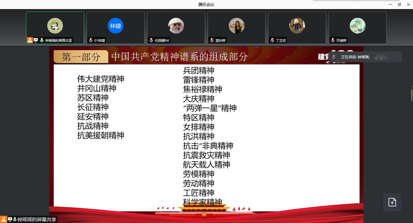 2021年10月11日,语言与文化学院学生第二党支部以三个党小组为单位在线上开展主题为“学习精神谱系,汲取奋进力量”的党日学习活动。会上,党小组成员们:重温习近平总书记在中国共产党成立100周年大会上重要讲话精神,学习了《党的伟大精神永远是党和国家的宝贵精神财富》,中国共产党人的精神谱系及《人民日报》近期发表关于中国共产党人精神谱系的系列评论员文章等,党小组成员联系自身学习与生活,积极讨论,交流心得。