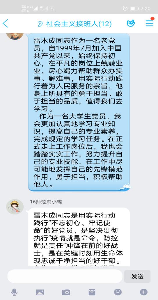 会上,党小组成员通过文章和视频的形式学习了雷木成同志的先进事迹,之后小组成员积极发言,潘文慧同志说道:“从雷木成同志身上我看到了作为一名党员冲锋在前的勇气,作为一名干部关注人民生命安全的父母心,作为一名捐赠者用自己的不完整延长他人的生命的无私奉献精神,他是我们的好榜样!”;蓝惠婷同志表示:“在学习过程中认识到了身为一名大学生党员,我们要学习雷木成同志的担当奉献精神,疫情当前,我们祖国面临着挑战。身为党员的我们,要充分发挥先锋模范作用,积极参与疫情防控志愿者活动,同时带头配合做好疫情防控筛查,及时向社区和学校报告个人及家人身体状况,让我们以习近平同志为核心的党中央坚强领导下坚定信心、众志成城、攻克难关”。