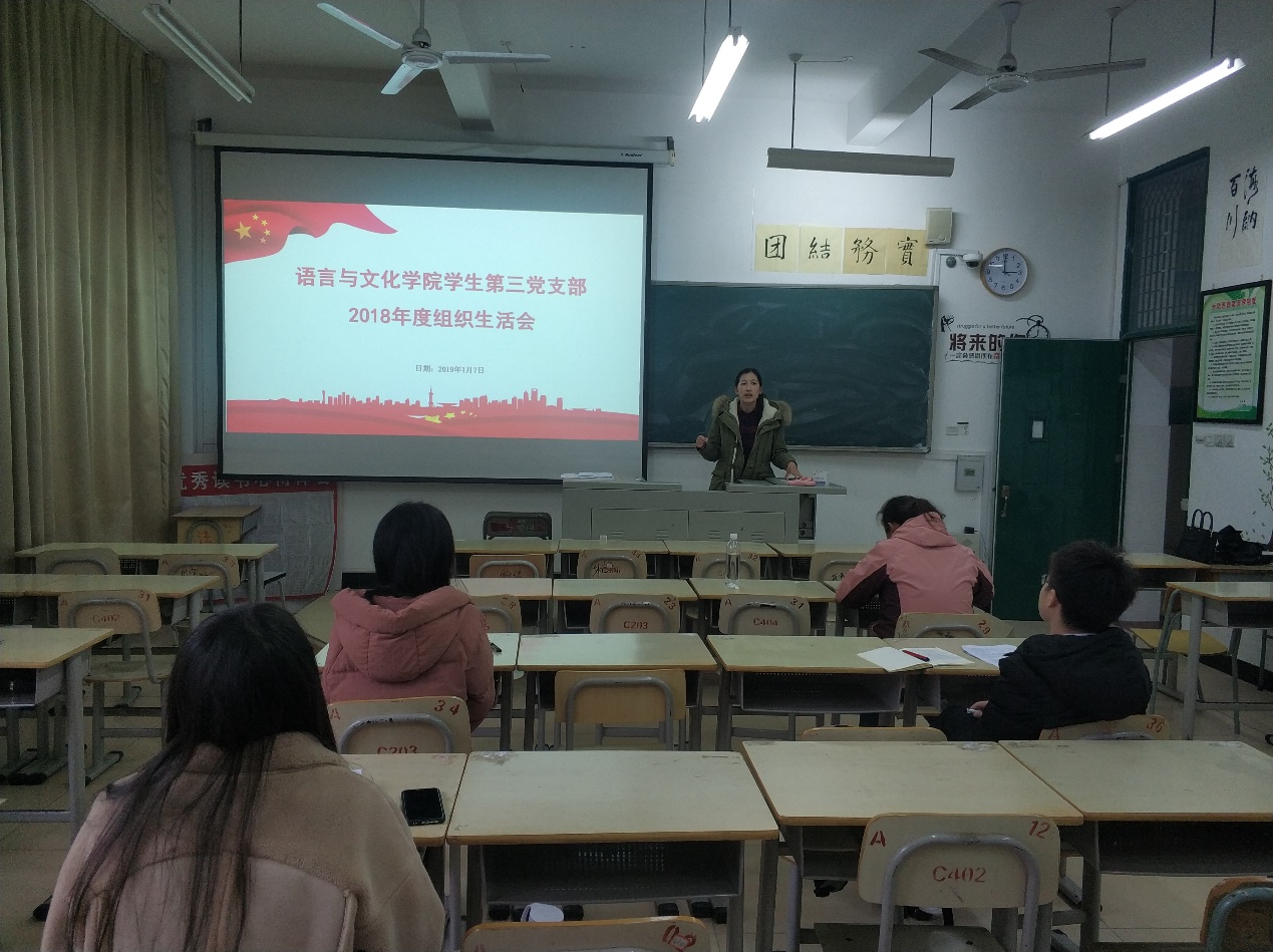 1月7日,语言与文化学院学生第三党支部召开了2018年年度组织生活会,开展了民主评议党员。全体党员参加会议。