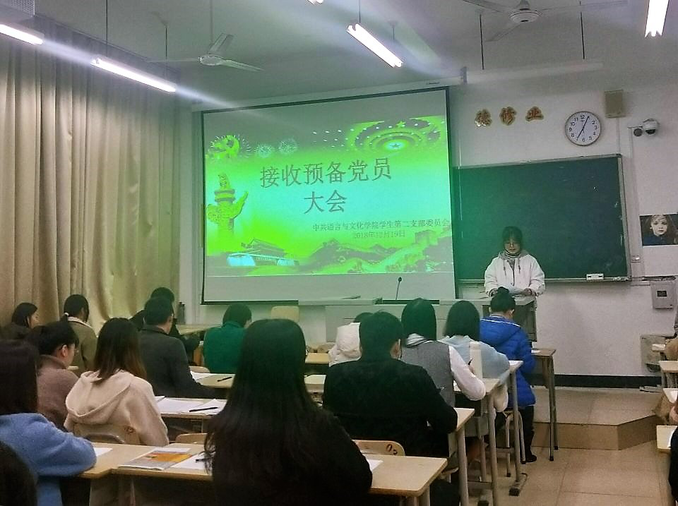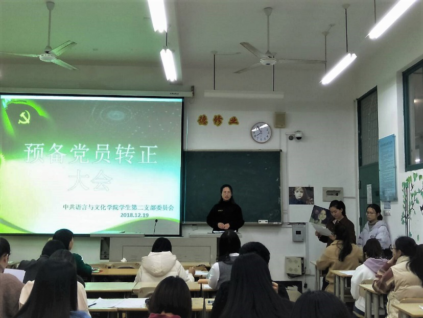 12月19日晚,语言与文化学院学生第二党支部在求知楼A203召开接收预备党员和预备党员转正支部大会,学生第二党支部书记祁燕苹主持会议,支部全体党员出席会议。
