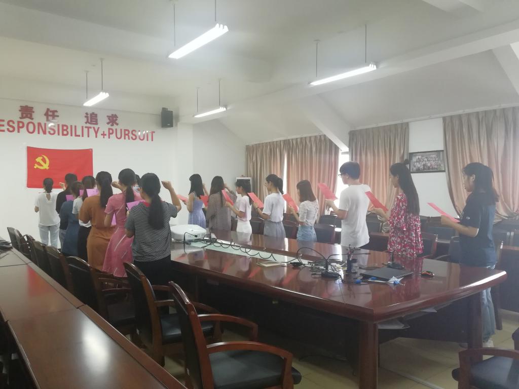 本次活动进行了充分的准备,包括布置会场、挂党旗、发放入党誓词、新发展党员签到等,并提前组织到场的党员们认真阅读誓词。宣誓仪式在庄严的国际歌歌声中开始,预备党员们在支部书记们的带领下,面向鲜红的党旗,齐齐举起右拳,庄严宣誓,发出了“为共产主义奋斗终身”的铮铮誓言,表达了为共产主义事业奋斗终身的决心和信念。宣誓完毕后,祁燕苹老师和王晓莹老师对新发展党员提出了几点希望:第一,要加强理论学习;第二,要加强党性修养,提高自身素质;第三,要提升科学文化知识和专业知识素养;第四,要起模范带头作用。她们勉励新党员们,奋斗新时代,担当新使命,要不忘初心,牢记使命。
