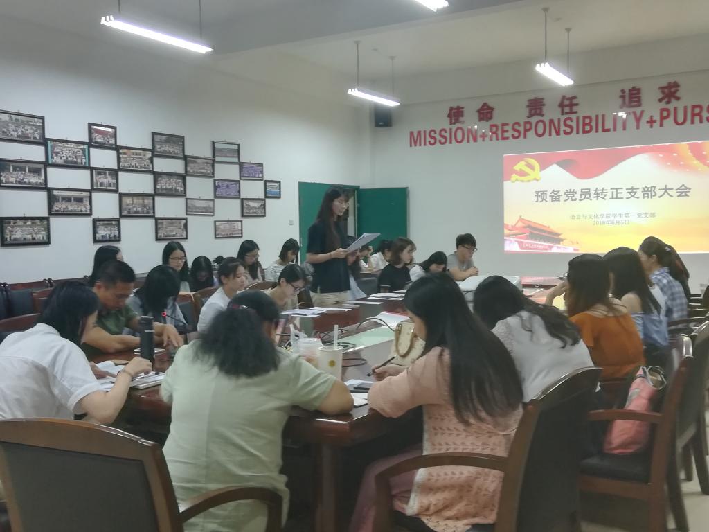 6月5日晚上6点半,语言与文化学院学生第一党支部在求知楼A407召开接收预备党员和预备党员转正支部大会,学生第一党支部书记王晓莹主持会议,支部全体党员出席会议。
