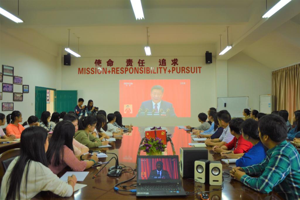 习近平新时代中国特色社会主义思想 2017年10月18日上午9时,中国共产党第十九次全国代表大会在北京人民大会堂隆重召开。语言与文化学院党委在求知楼AA407组织师生集中收看中国共产党第十九次全国代表大会开幕式现场直播。学院党政班子成员、教师代表、辅导员和学生代表60多人参加观看。