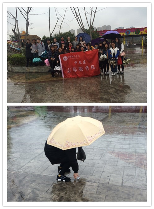16级汉语言文学师范班团支部成员在雨中进行环保活动