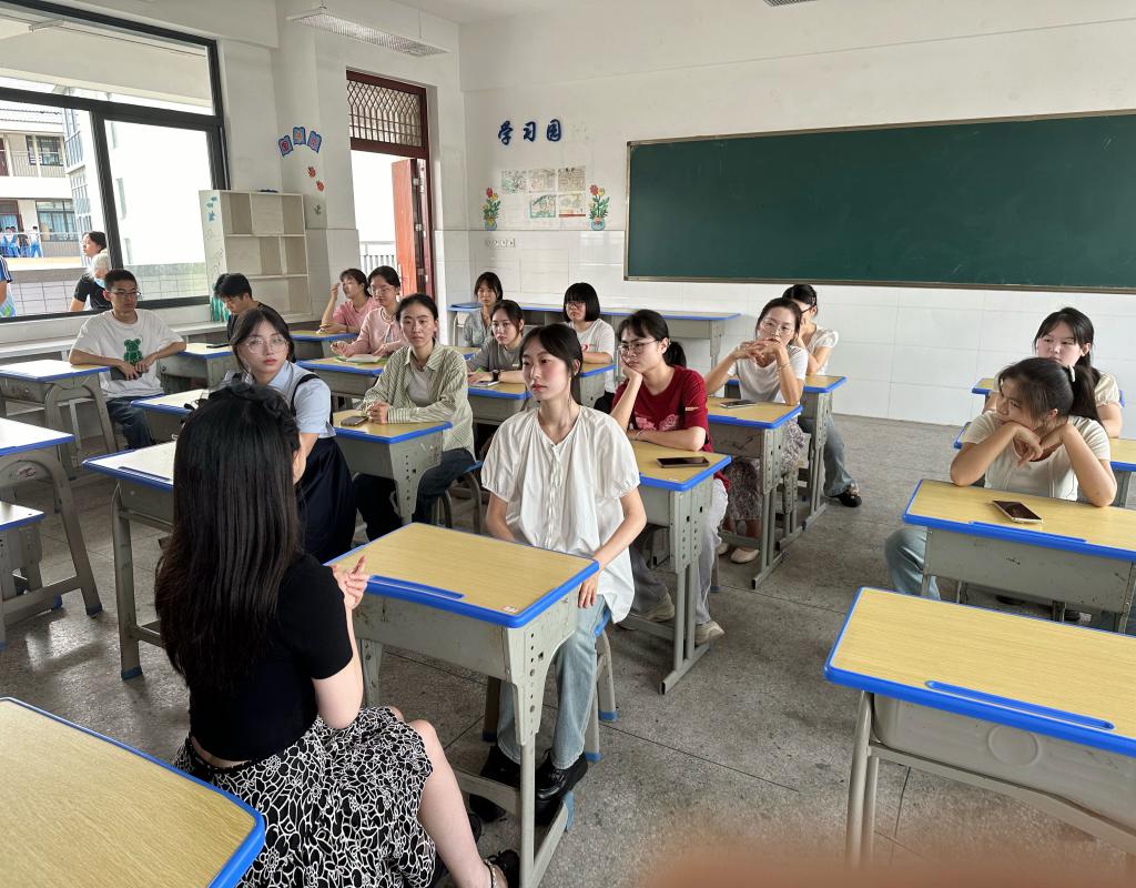 抵达实验学校后,两位老师与全体实习生进行了亲切的座谈会。会上,实习生们纷纷分享了自己这一周来的实习体会。他们表示,目前与校外指导老师的相处十分融洽,工作氛围积极和谐。在实习内容的安排上,实习生们现阶段主要聚焦于了解学情、细致批改作业以及认真聆听课程,同时,校外指导老师也会悉心引领他们逐步参与课堂教学,给学生上课,借助这些丰富的实践活动,实习生们对中学英语教学获得了更为直观且深刻的理解。