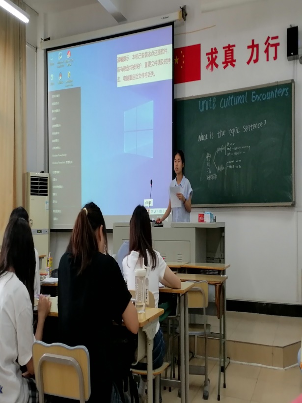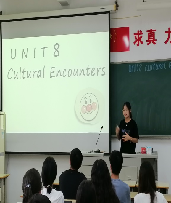 此次公开课的授课对象为2023级英语(师范)1班学生,此次课堂主要为学生团队作业的展示课。第七组同学(周兰、曾琪、刘丁萃和黄月瑶)从Lead-in,New Words, Text Analysis 和Summary四大教学环节对第八单元Cultural Encounters做了精彩的教师技能展示。之后,其他六组组长对该组做了精彩点评和评分,最后蔡老师对该小组的四个小老师一一做了很详细的点评和教学建议。