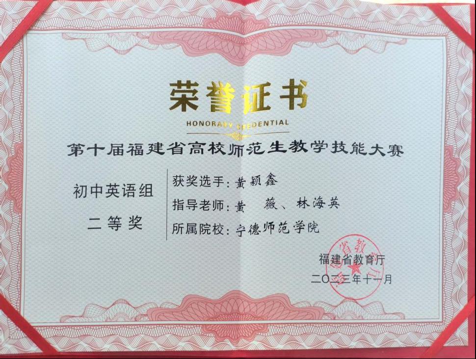 在片段教学以及专家提问环节中,英语(师范)专业的选手结合新课标有条不紊地向现场的评委老师们展现了清晰的教学思路、精确精炼的语言表达、独特新颖的教学方法、端庄大方的仪态仪表,充分展现了我院英语(师范)专业学生深厚扎实的英语功底和拼搏进取的精神面貌,最终我院英语师范专业学生取得优异成绩,黄颖鑫同学获得初中英语组二等奖。