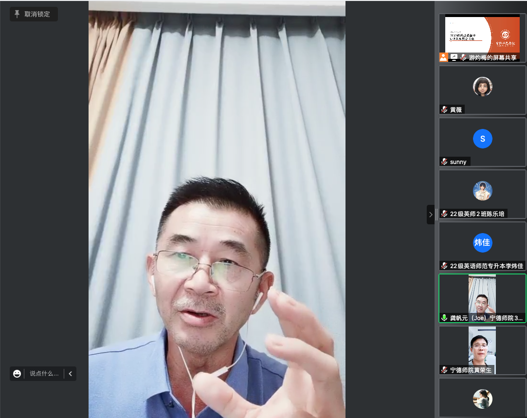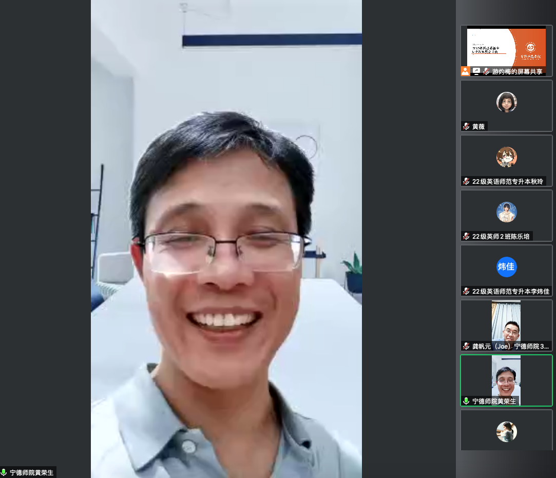 2022年9月15日晚上,英语系于腾讯会议线上召开了2022级英语专业新生教育大会,副院长黄荣生、副书记陶莉、专业带头人龚帆元、系主任游灼梅、系副主任黄薇及三位学习班主任等教师参加了此次动员大会,会议由游灼梅老师主持。