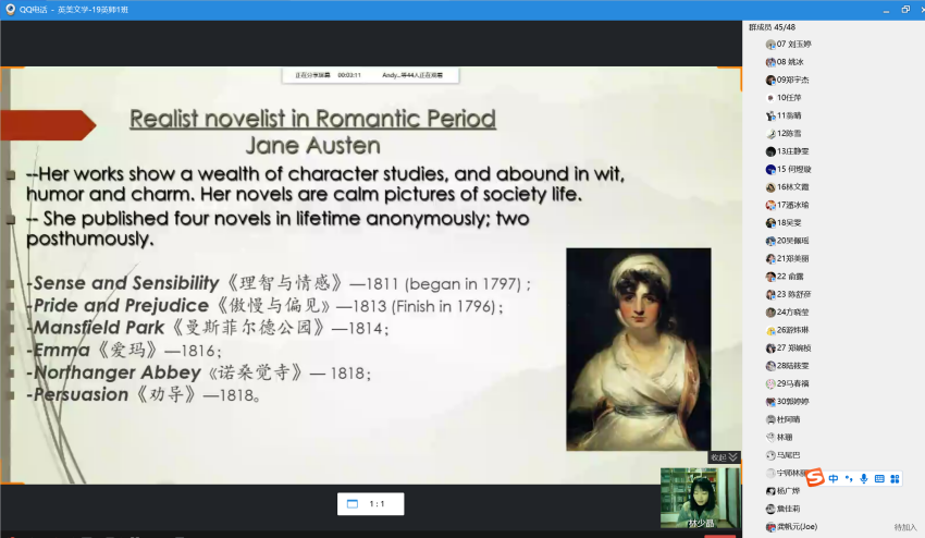 本堂课的教学内容Chapter V Jane Austen Pride and Prejudice,林少晶老师首先对作家及作品展开详细的介绍,循序渐进地引导学生了解相关背景知识。接着在语篇解读的过程中结合音频,生动地将学生领入作品中的文学世界,促使学生对文字展开思考。所有教学环节均深入浅出,既有对学生已掌握知识的回顾,也有对文学作品语言特色、戏剧冲突的分析,取得了较好的课堂效果。