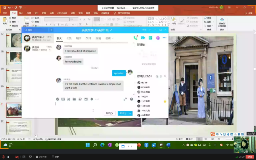 2022年3月28日上午,我院英语系博士林少晶老师在QQ平台开设了一场《英美文学》线上教学公开课,授课对象为2019级英语(师范)1班的全体学生,院领导、教学督导、英语系教师以及其他系部的部分教师及学生代表参与了听课及评课活动。