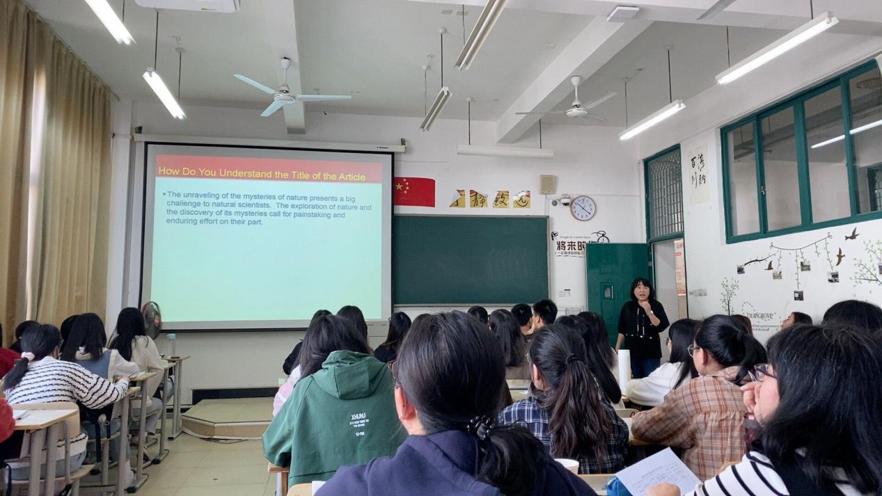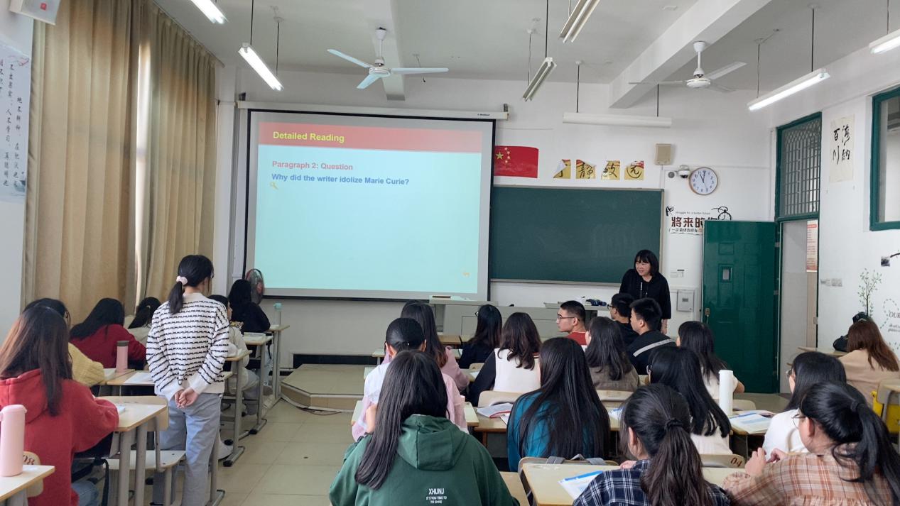本次公开课内容为《高级英语1》第四单元的导入课程,授课对象为18级英语(师范)1班学生。在向学生们明确了本课的教学目标后,张老师开始了导入内容。首先四张图片开始引入文章标题“Force of Nature”,通过问题引导启发学生思考文章标题的含义。又通过一些文字信息,进一步引出了本课要介绍的主人公居里夫人。教学安排行云流水,每部分环环相扣,节奏张弛有度。整个教学过程中充分和学生互动,课堂气氛轻松活跃,时不时爆发出欢乐的笑声。