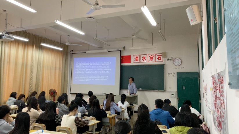 本节课的主题为Force of Nature,授课对象为大三英语(师范)专业的学生。林煌贿老师在回顾上节课的内容后,继续对本节课的文章段落进行了细致的讲解,通过问答练习梳理居里夫人的生平,引导学生领会文字背后的情感和态度,为同学们展现了一位有血有肉的女性科学家形象。