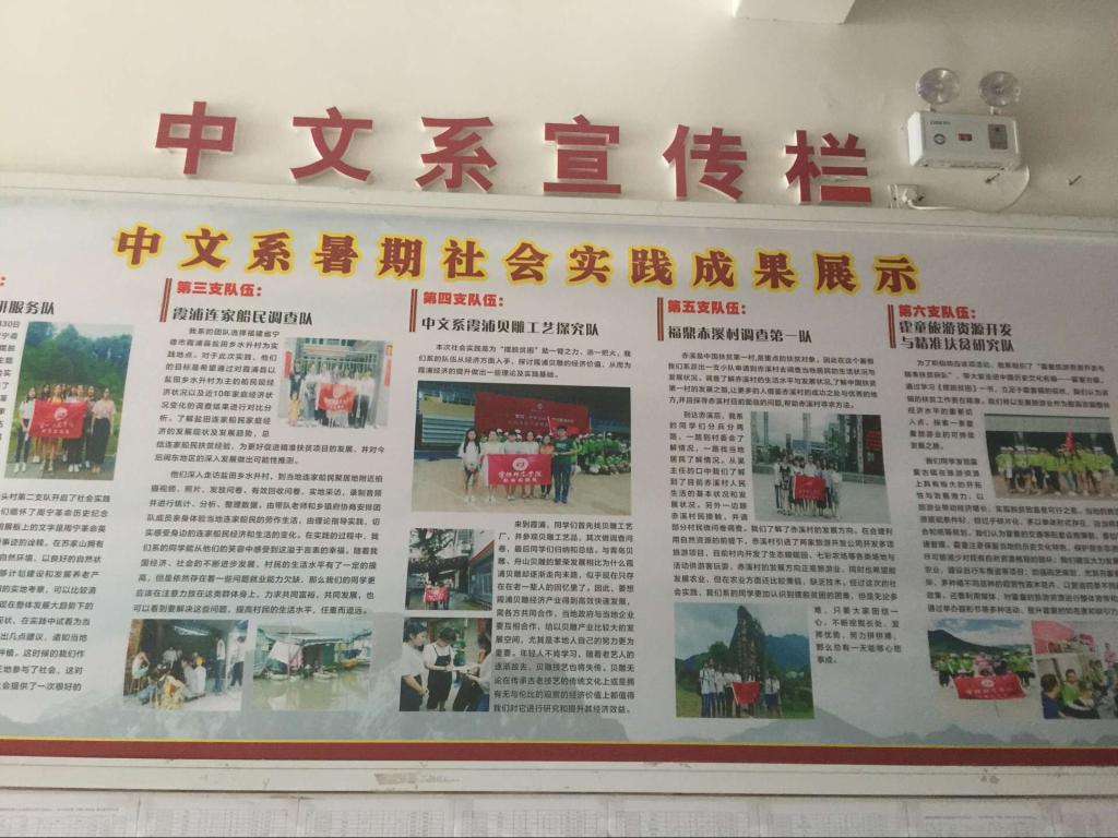 今年暑期社会实践,汉语言文学系由老师带队派出7支队伍分赴周宁,霞浦,霍铜,柘荣等地,开展了以支教,贫困调研,村官助理,文化与产业调研等为主的社会实践活动,受到了当地群众的一致好评。宁德晚报,闽东日报,东南网,柘荣电视台等媒体对汉语言文学系开展的各项活动进行了多角度的报道。