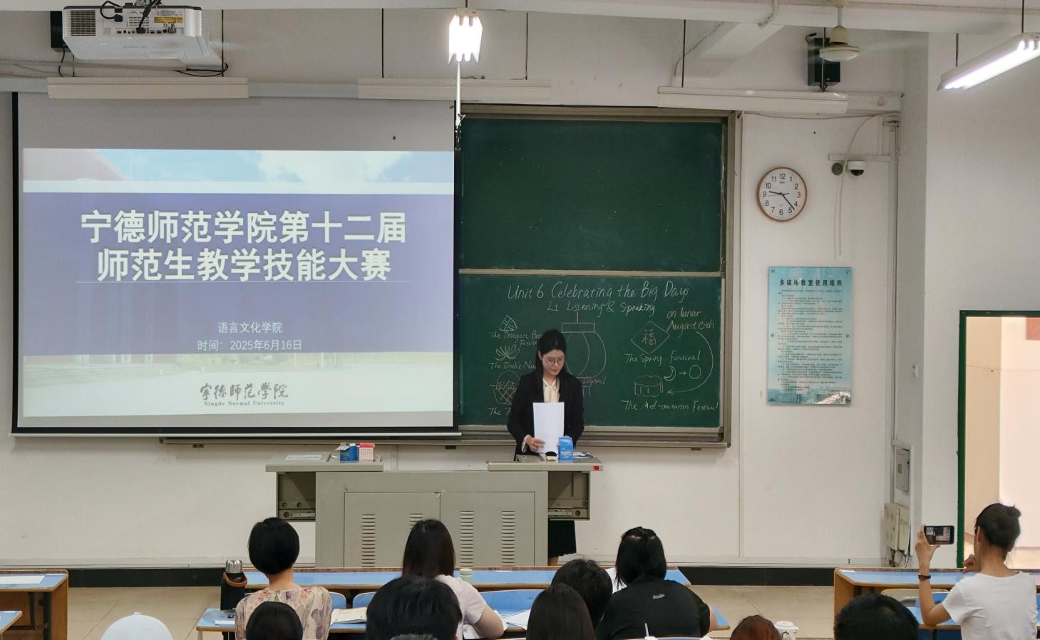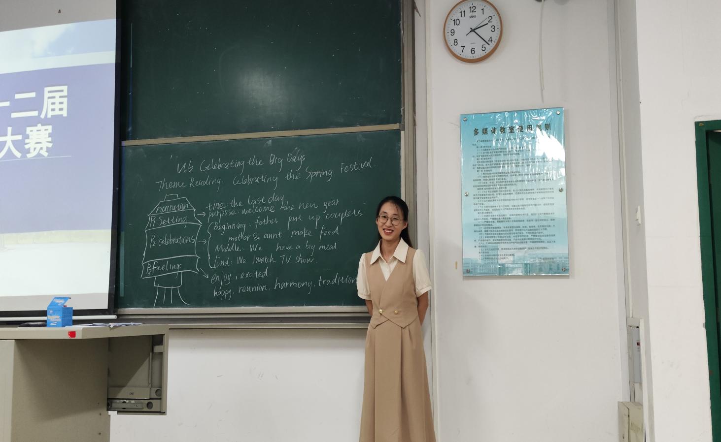本次大赛在求知楼AA301,举行,现场气氛热烈。比赛分为多个环节,包括教学设计、模拟授课、即兴问答三个环节,全面考查选手的专业素养、教学技能和综合能力。教学设计环节,选手们详细阐述了自己的教学设计思路、教学目标、教学重难点、教学方法以及教学过程等。他们的教学设计紧扣课程标准,体现了以学生为中心的教学理念,注重培养学生的语言综合运用能力和创新思维能力。模拟授课环节更是亮点频现。选手们精心准备教学内容,根据不同的教学对象和教学目标,设计出各具特色的教学方案。在课堂上,他们教态大方自然,语言生动形象,通过多样化的教学方法和丰富的课堂互动,将知识巧妙地传授给学生。有的选手运用情景教学法,创设生动有趣的情景,让学生在情景中学习和运用英语;有的选手则注重启发式教学,通过提问、引导等方式,激发学生的思维能力。选手们还充分利用多媒体资源,制作精美的课件,辅助教学,使课堂更加生动直观。在即兴问答环节,选手们围绕所教授的单元内容及其他教育教学相关话题,在规定时间内迅速组织语言,发表观点。他们逻辑清晰、语言流畅,展现出扎实的语言功底和对教育问题的深入思考。