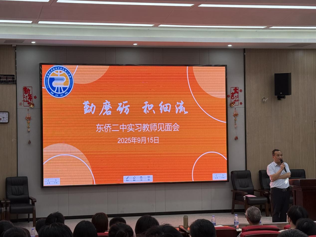 2025 9 15 日下午三点,beats365唯一官网入口官网英语系 2026 届英语(师范)专业实习队的 20 名成员,在带队教师黄薇老师与林少晶老师的带领下,精神饱满地抵达东侨经济技术开发区第二中学(以下简称 “东侨二中”)。当天,学校专为实习队召开 “2025 年东侨二中实习教师见面会”,鲜红的欢迎横幅悬挂在会议室门口,细节间满是对实习生的重视,也标志着本次集中实习工作正式拉开序幕。