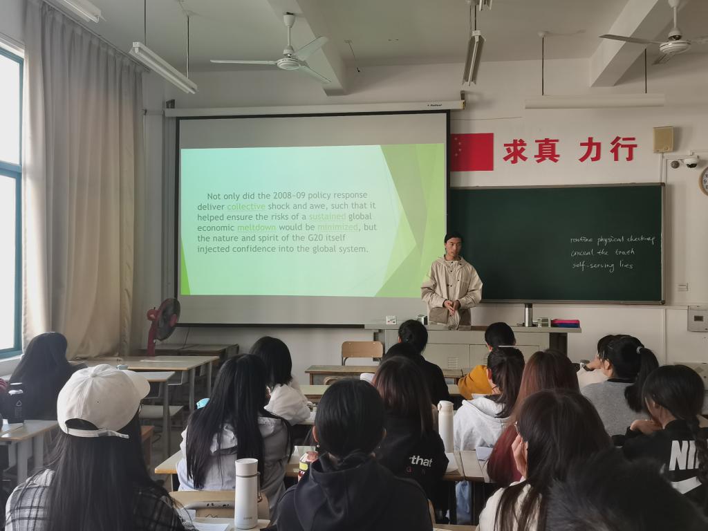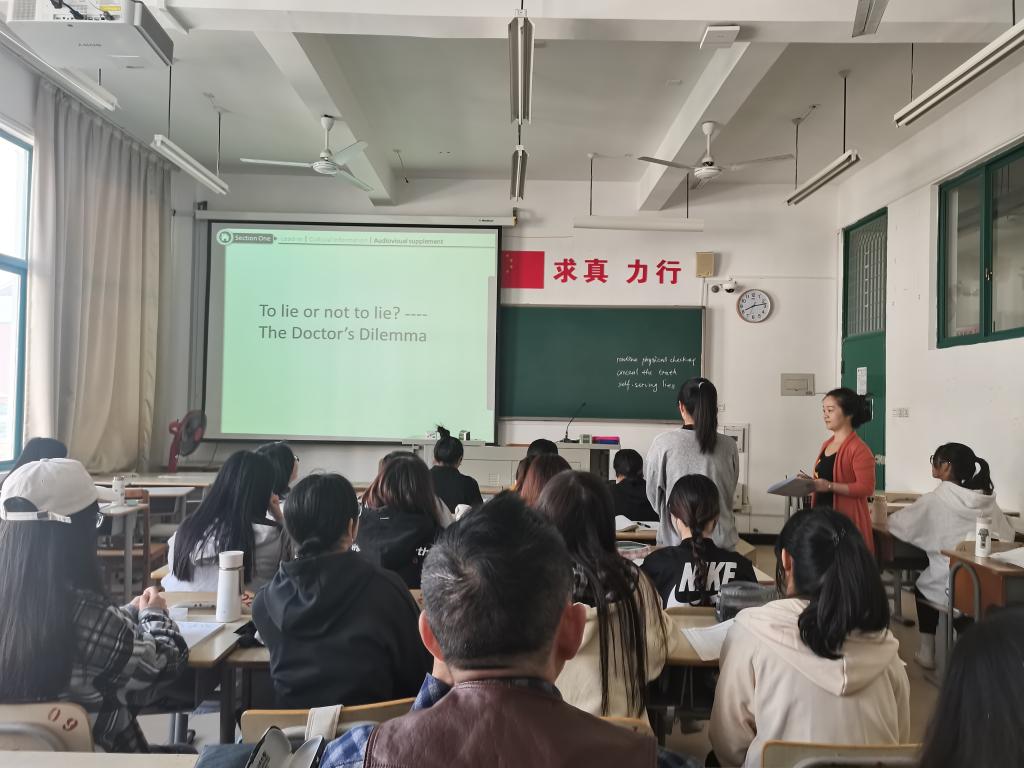 2021年11月10日上午,2021-2022学年第一学期英语系的第四场教师教学公开课在AA304教室举行,本次公开课由许秀玲老师授课,主题为《综合英语3》Unit 6 The Real Truth about Lies,对象为2020级英语(师范)1班的全体学生。英语系的5位教师参加了听课观摩活动。