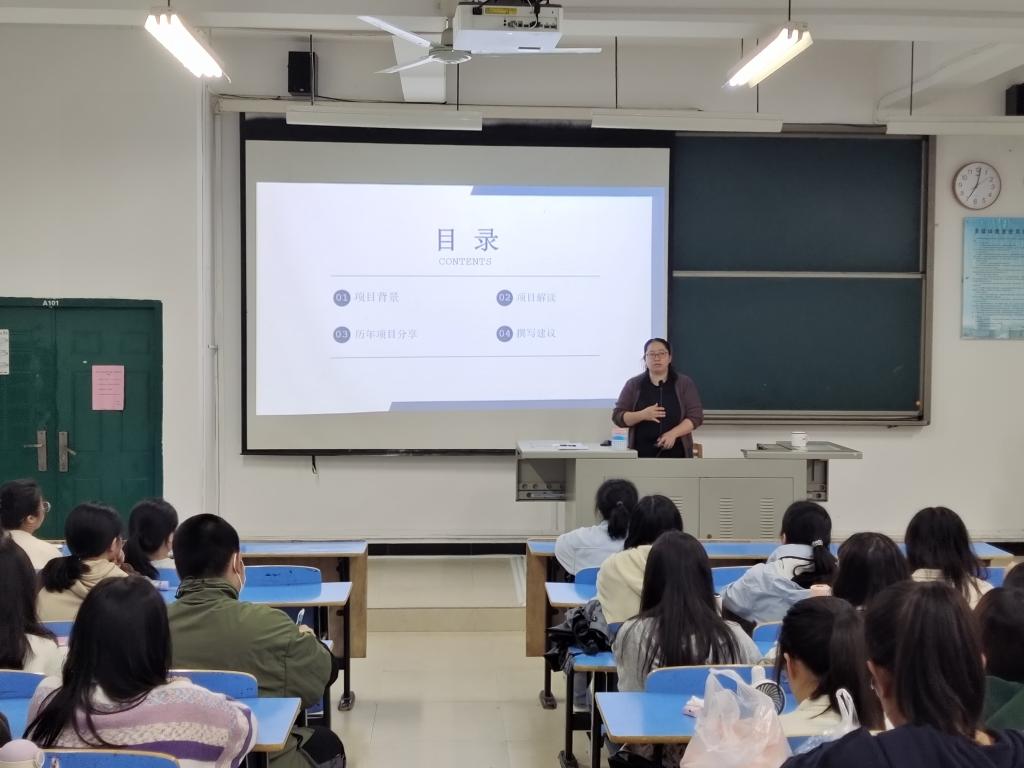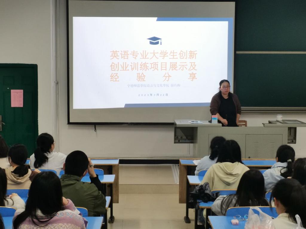 为积极推进在校大学生申报大学生创新创业项目,3月22日晚上,英语系主任游灼梅老师在语院求知楼AA101开设“英语专业大学生创新创业训练项目展示及经验分享”讲座,英语专业100位学生参加了本次讲座。