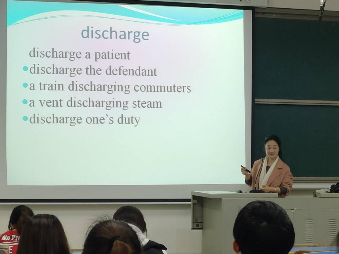 许秀玲老师从“光”的隐喻表达顺势引入今天讲座的核心概念 ‘metaphor’, 然后列举了诸多生动形象的例子,比如discharge在不同语境中的不同含义,让同学们真切地体会到一词多义现象的巧妙之处。接着秀玲老师着重介绍了英语词义denotation 和connotation的区别,她指出,在学习英语转意词的过程中要学会利用我们的发散性思维。通过与同学们一起分析例句,研究同一个单词在不同语境中词义的演绎延伸,秀玲老师调动了大家的思维,让大家注意到了平常被忽略的词义引申背后的机制:隐喻机制。