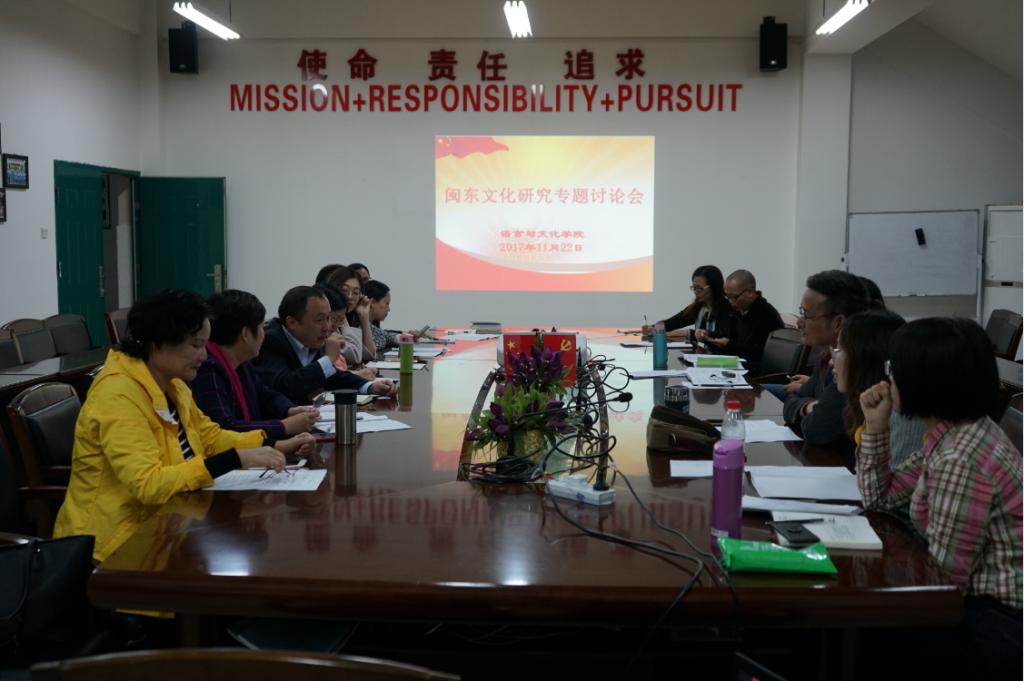 语言与文化学院成立以来,闽东文化研究专题第一次研讨会于2017年11月22日下午3:30在求知楼AA407举行,语言与文化学院副院长陈丽冰主持会议,闽东文化研究中心主任伊漪教授、陈开福常务副主任及陈靖姑文化研究团队、畲族村落文化研究团队的成员参加了讨论会。