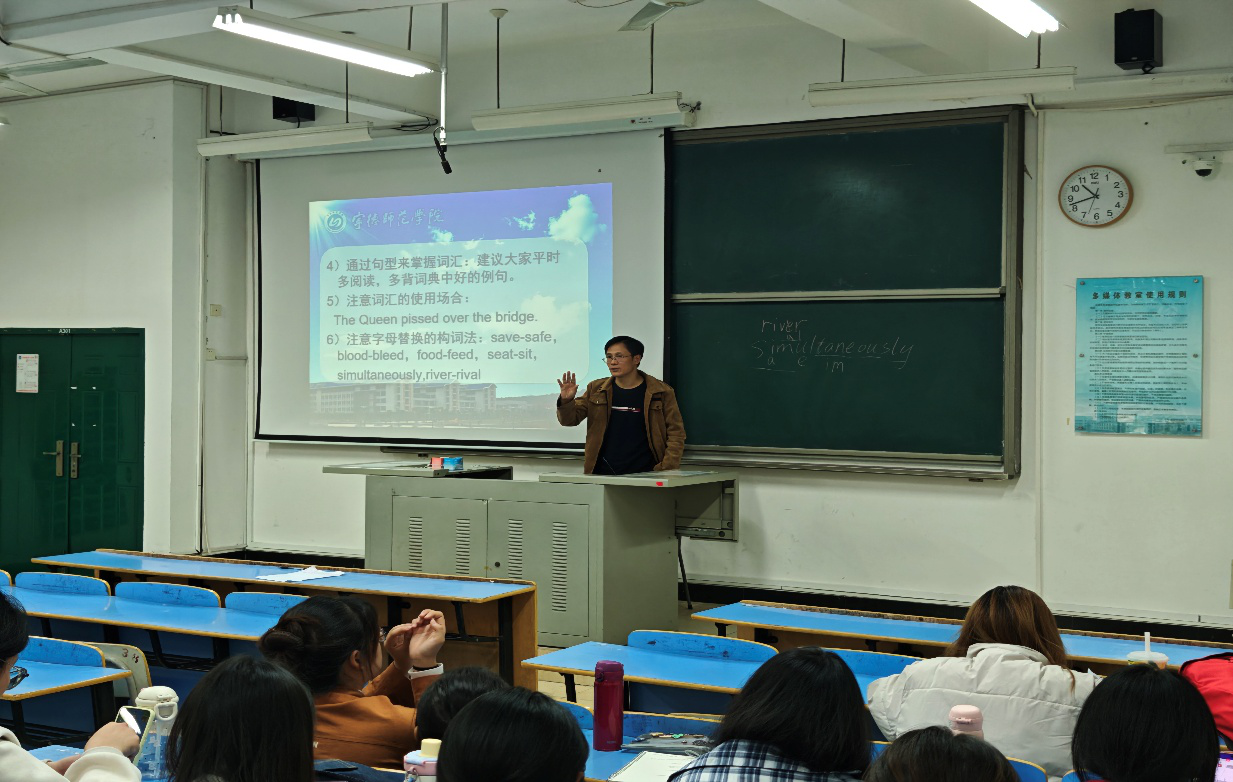 讲座中,黄老师以英语专业学习的核心环节——听、说、读、写四项基本技能为脉络,系统阐述如何扎实打好语言基础。他结合自身多年教学实践,指出了学生在各技能习得中的常见难点与提升策略,强调语言基本功与专业认知能力相辅相成的关系。黄老师通过具体案例,说明如何将语言训练与思维培养、文化理解相结合,引导学生在掌握语言工具的同时,深入体会英语学科的内涵与价值,从而提升专业认同感与学习主动性。