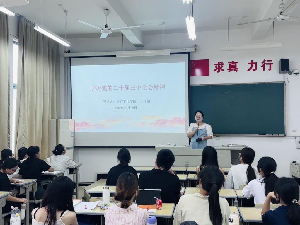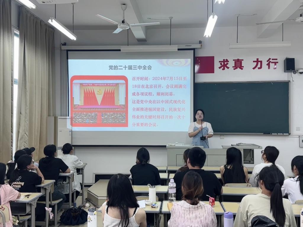 为深入学习贯彻党的二十届三中全会精神,引领我院团员青年更加紧密地团结在以习近平同志为核心的党中央周围,高举改革开放旗帜,凝心聚力、奋发进取,为全面建成社会主义现代化强国、实现第二个百年奋斗目标,以中国式现代化全面推进中华民族伟大复兴而努力奋斗。2024年9月29日下午,院团委书记元佳珺面向23级商务英语专业学生在求知楼A306教室开展学习党的二十届三中全会精神会宣讲活动。