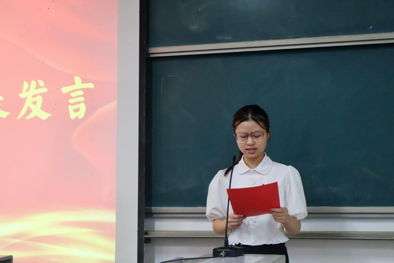 在团员代表发言环节,入团介绍人代表林暄宣读了《团章》中有关团员的义务和权利的条款,新团员代表曾玉琦和优秀团员代表王安空都发言表示,作为一名共青团员,我们要用实际行动来切实履行团员义务,在学习生活中严格要求自己,以身示范、奉献自己。