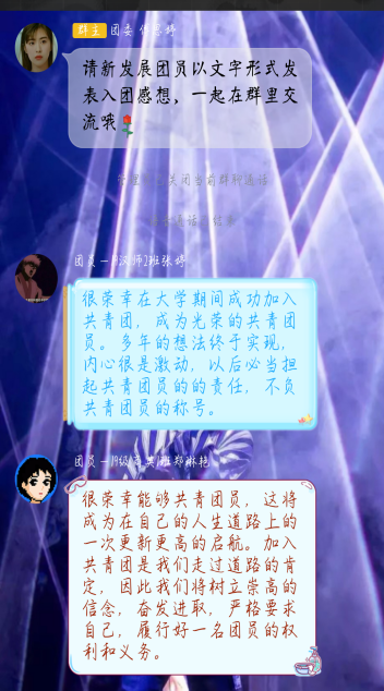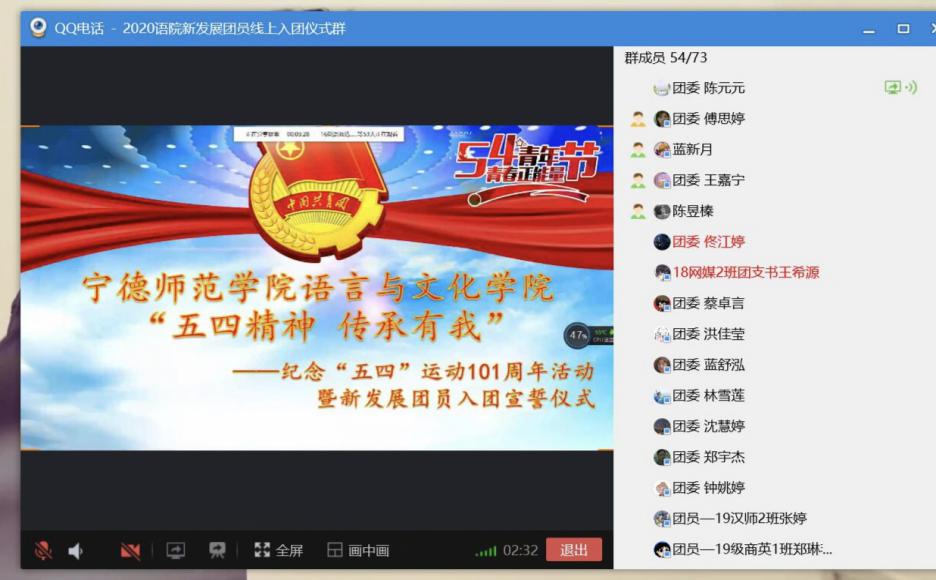 本次活动采用线上形式,组织我院各团支部完成了五四精神和共青团知识的主题学习,开展了语言与文化学院2020年全体新发展团员入团仪式。活动开始,主持人先通过播放视频带领大家学习五四精神和共青团历史,接着由语院团委书记元佳珺公布2020年语院新发展团员名单,院团委副书记傅思婷带领新发展团员进行入团宣誓。全体活动参与者面向团旗齐唱团歌,新发展团员2019级商英一班郑琳艳代表全体新发展团员发表入团感言“我立志加入共青团,我们今天在这里宣誓取得了团员的资格并不意味着我们追求的结束,而是我们在自己的人生道路上一次更新更高的目标”。