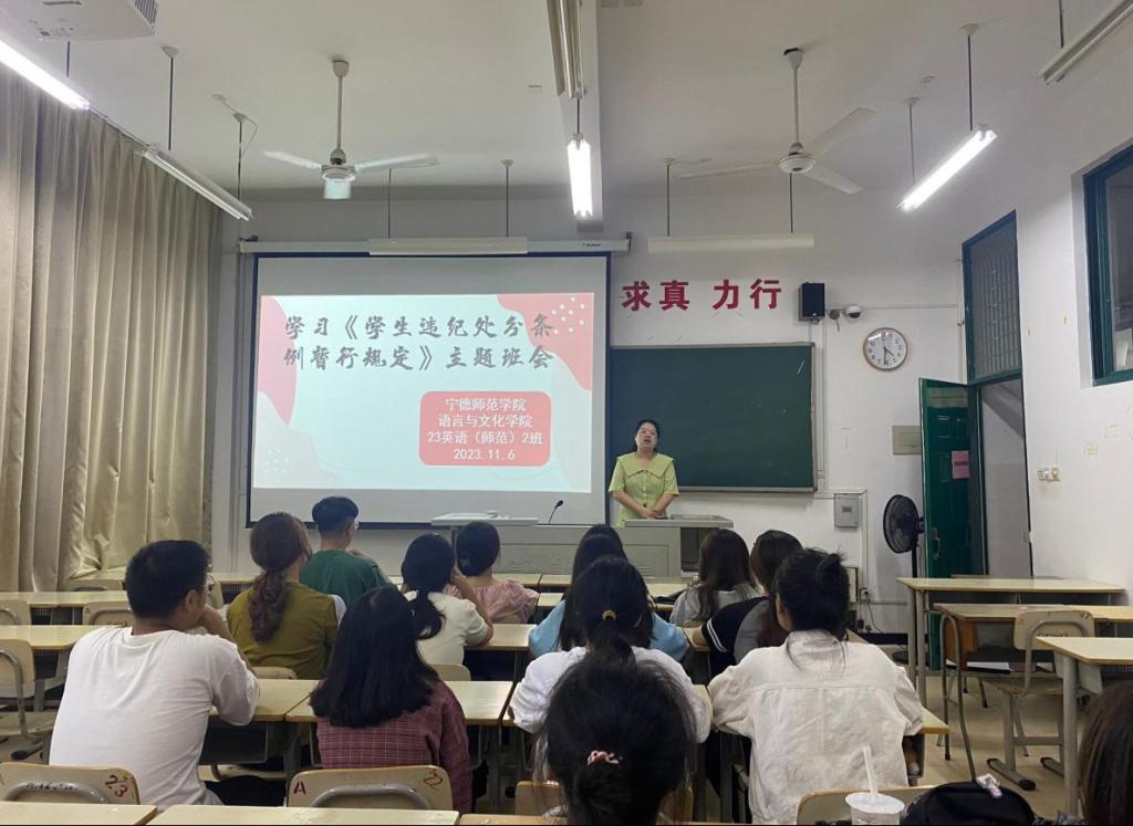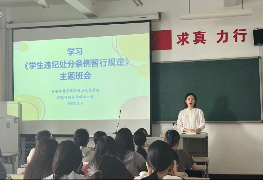 为了进一步做好语言与文化学院“三全育人”综合改革试点工作,规范学生宿舍管理,维护学校正常的宿舍管理秩序,进一步加强校园精神文明建设,强化学生树立遵规守纪意识。2023年11月6日,语言与文化学院辅导员组织我院各班级900多名学生开展了学习《学生违纪处分条例暂行规定》主题班会活动,通过学习第三十四条违反学校关于宿舍管理规定及违纪处分相关条例,引导学生形成遵规守纪的意识,自觉规范行为举止,营造安全、文明、有序的宿舍氛围。