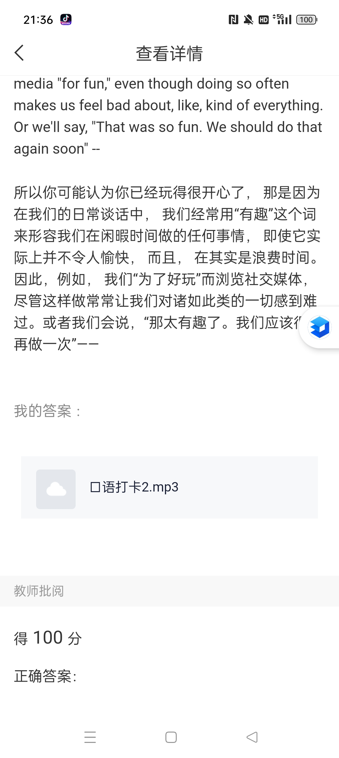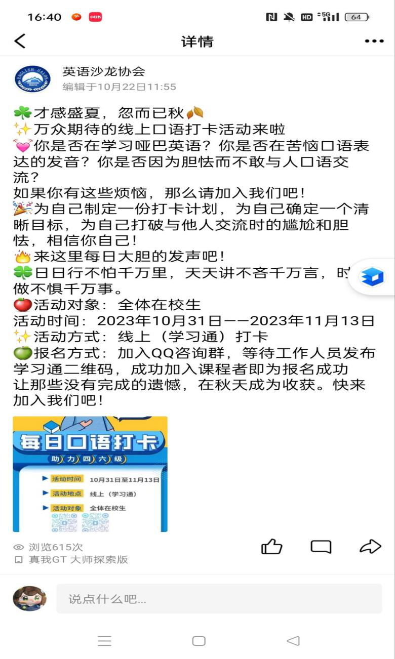 本次活动分为两个周期,10月31日到11月6日为第一周期,11月7日到11月15日为第二周期,工作人员在学习通发布汉译英作业,同学们提交翻译的英语录音文件为打卡成功。根据每日的打卡提交情况,同学们每天都积极地在平台上参与打卡活动,分享他们的学习成果和进步,很多同学表示通过本次活动提升了自己的口语水平。