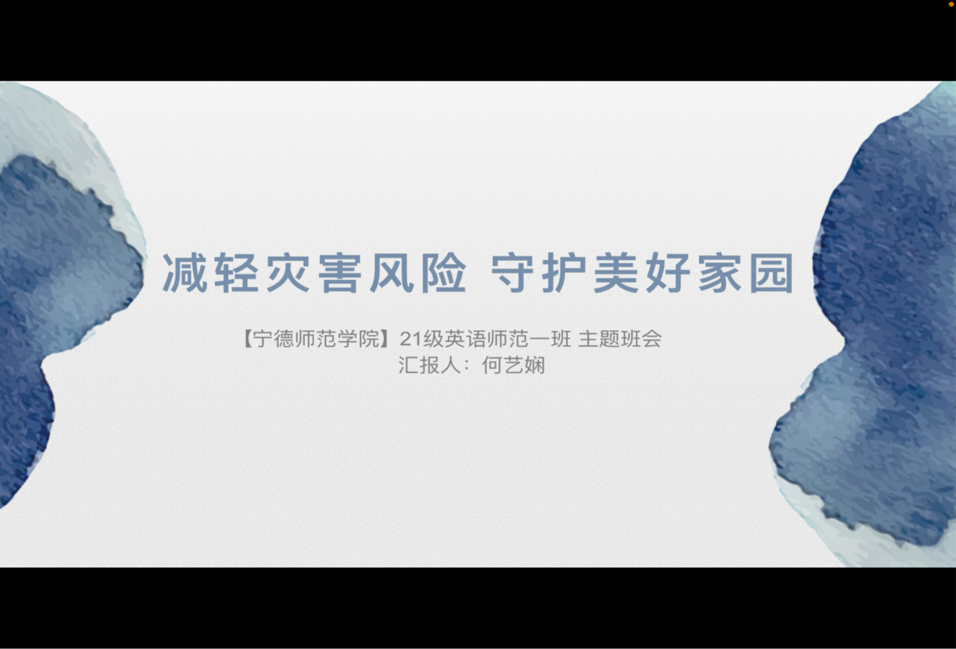 蓝艺梅(19汉语言文学(师范)1班):未雨绸缪,防患未然,是安全教育永恒不变的基石;保障生命,尊重生命是安全教育永恒不变的主题。大家都知道,自然灾害的发生是人类无法抗拒的,但是人们可以通过有效的措施把自然灾害造成的损失降到最低限度。所以为了使学生了解并掌握必要的防灾减灾知识,我们特此召开“减轻灾害风险,守护美好家园”主题班会活动,希望同学们在突遇危急情况时能够进行一些有效的举措,从而保护自己减少伤害。同学们也要在努力保障自己生命安全的前提下,尊重他人的生命权。当危险突然来临时,不能自私自利夺路而逃,更不能为保障自己的生命权而恶意损害他人的生命权。要服从指挥,从容镇定,遵守秩序,让所有人在最短的时间内撤离到安全的地方。愿警钟长鸣,生命之树常青。