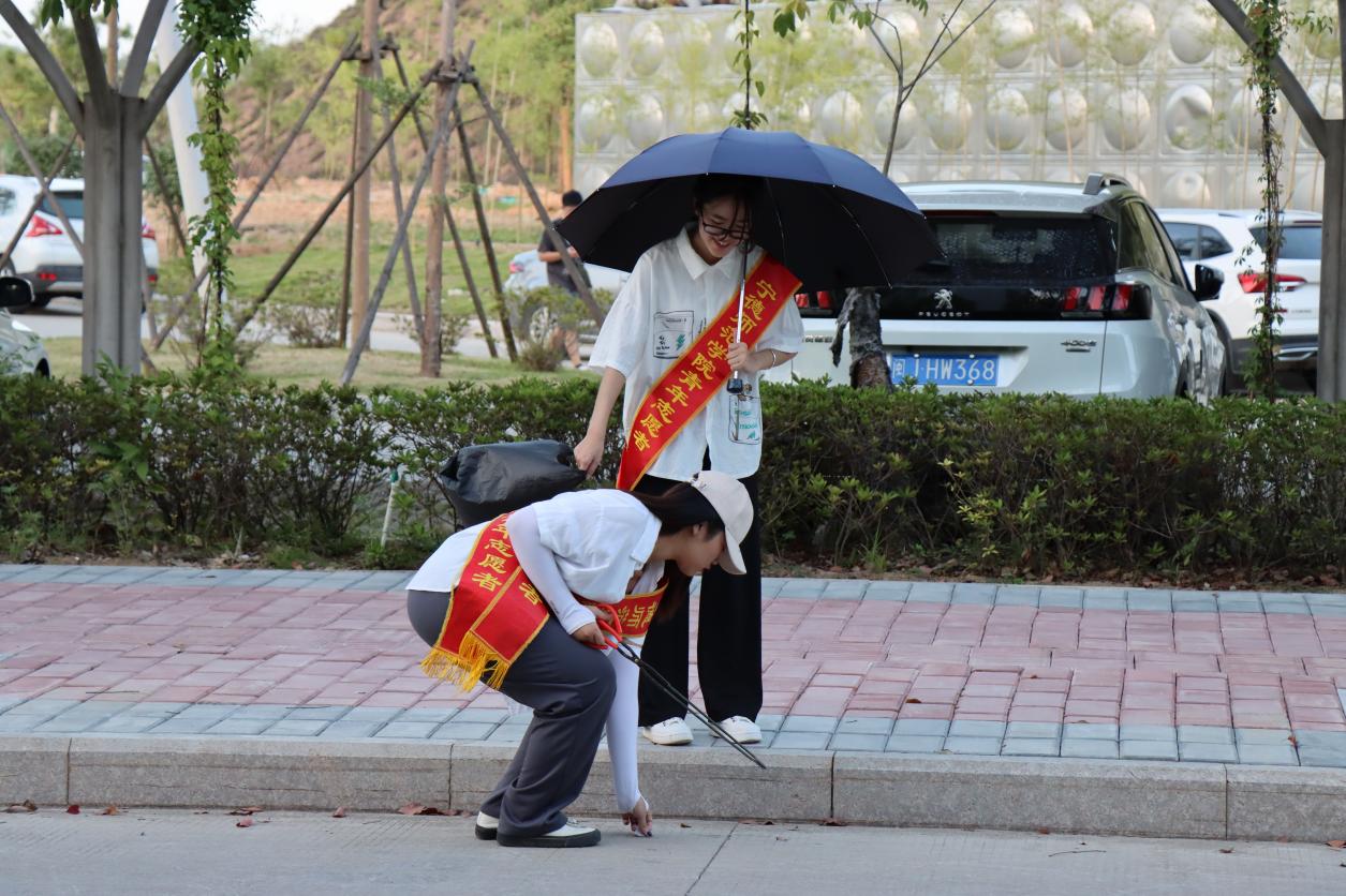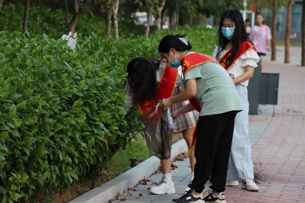 同学们拿着拾捡夹和垃圾袋,仔细地寻找草丛中掉落的烟头和负责区域周边的垃圾,拿着扫帚清理堆积的落叶。经过同学们的认真的清理后,整体环境变得焕然一新。