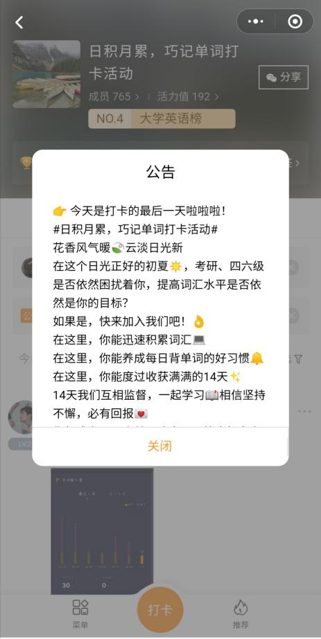 本次单词打卡活动要求参与者在指定的单词APP上,完成每日不少于三十个新单词的记忆任务并截图上传到微信“小打卡”小程序上,坚持14天便可获得相应奖励。