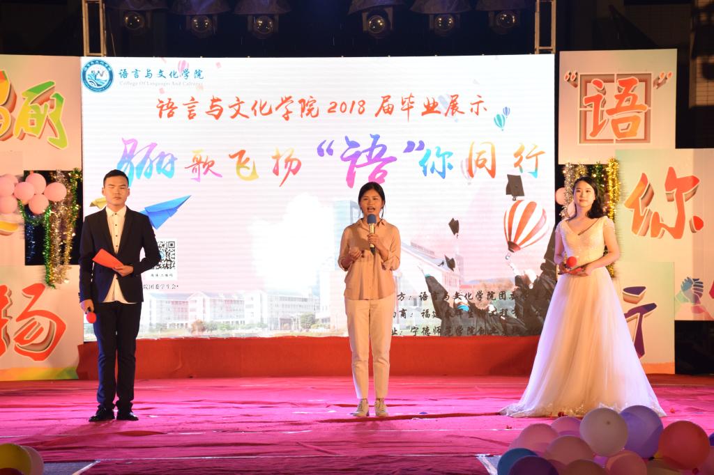 6月12日晚,我院在东侨校区图书馆门前广场举办以“骊歌飞扬,‘语’你同行”为主题的毕业晚会,送别我院2018届毕业生。院长龚帆元,院党委书记张晓芳,副院长陈丽冰,院党委副书记陶莉与数百名师生们一同观看了本次晚会。