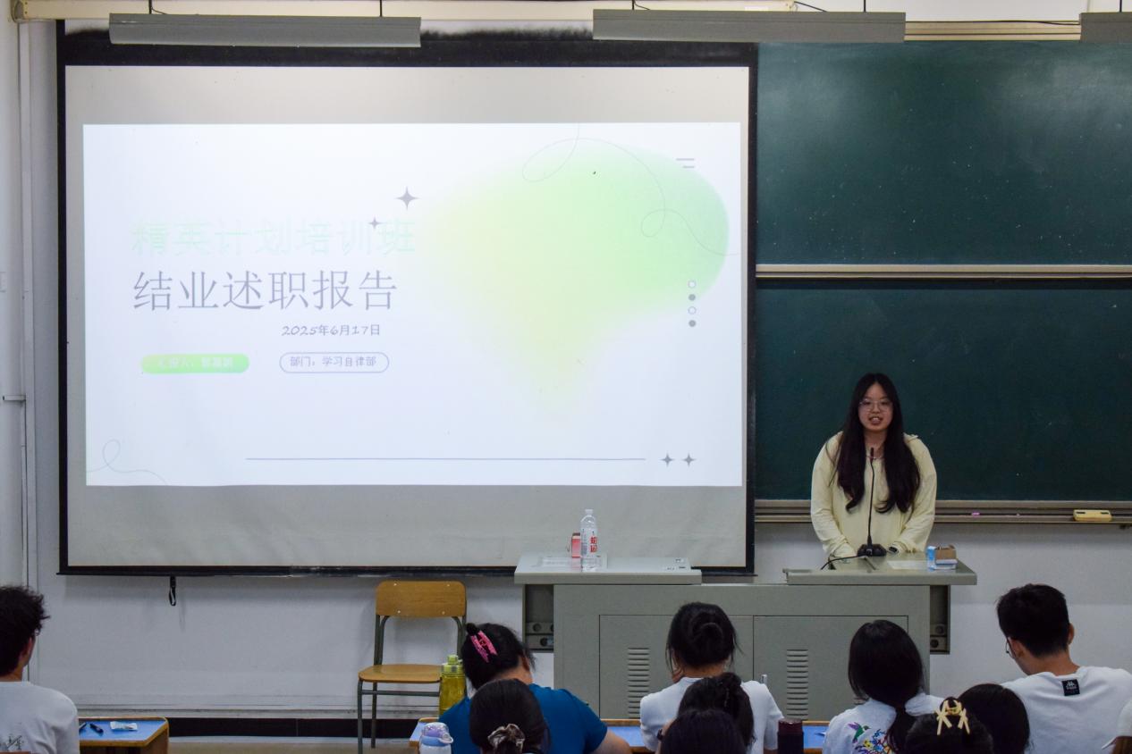 在汇报会上,学员们依次登台,通过精心准备的PPT展示培训收获。每个学员围绕着具体参与的活动,收获与心得体会,发现的问题与改进意见等模块来总结在精英计划中的经历,并将自己的个人特点、自我分析等融入汇报,体现了学生干部的反思精神与个性发展。