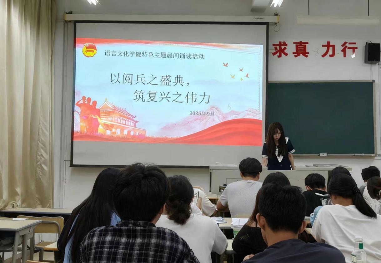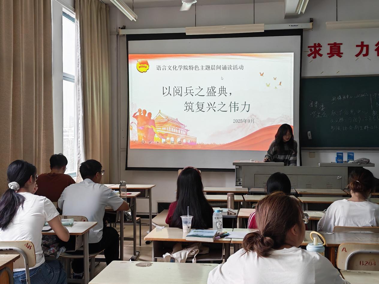 为了深入贯彻落实爱国主义教育要求,将九三阅兵盛典中蕴含的民族精神、家国情怀与青年担当深度融入校园文化建设,把抗战精神转化为奋进新征程、建功新时代的强大动力,我院团委于2025年9月23日至9月29日开展“以阅兵之盛典,筑复习之伟力”主题晨间诵读活动,语院24个团支部积极参与本次活动。