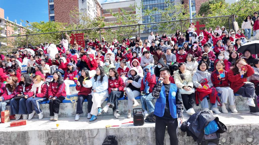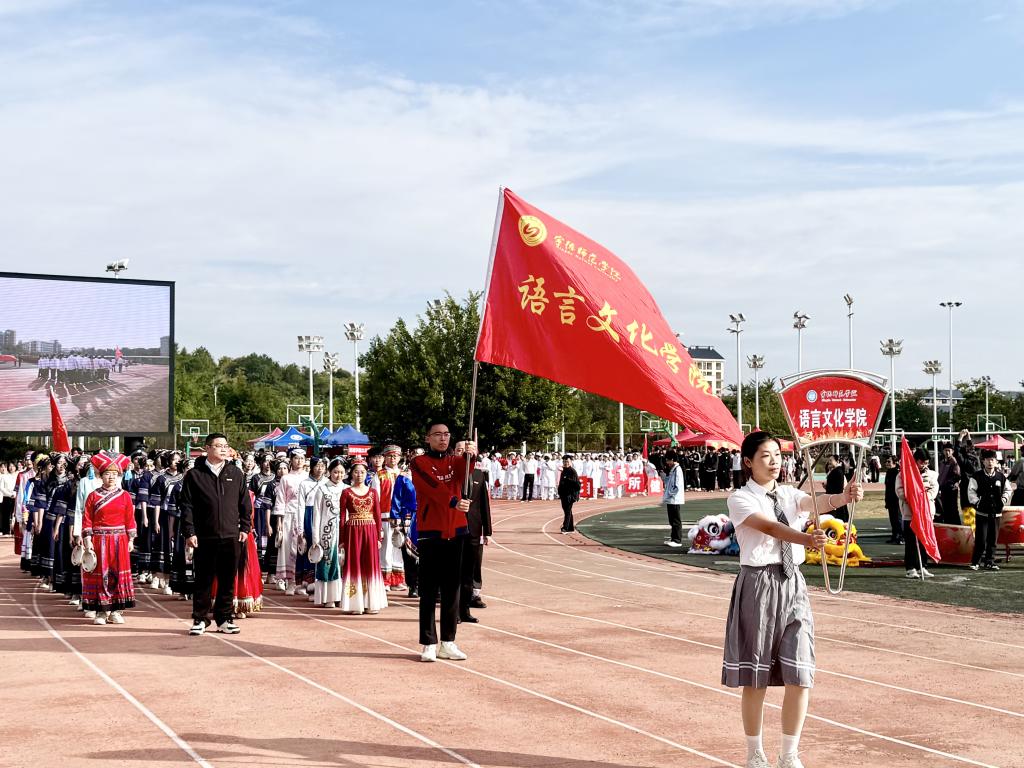 语言文化学院党委书记吴立志、党委副书记李成皓、团委书记林鹤之携全体辅导员统筹赛事组织与后勤保障,全程为学子保驾护航。开幕式上,林鹤之老师精心指导的学院方阵,以铿锵步伐、昂扬姿态亮相,将民族文化底蕴与青春朝气相融,充分展现语院的精神内核。